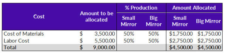 Applying volume-based costing and if we produce equal quantities of each type of mirror (1000 units of each), the cost allocation would be as follows: