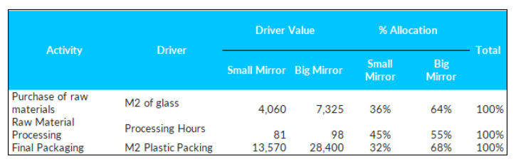 Theory is best understood with an example. This is an example overly simplified for academic purposes. Let's suppose we have a company that manufactures two types of mirrors: Large Mirror and Small Mirror. To manufacture these products, the company carries out three main activities: raw material procurement, raw material processing, and final assembly.