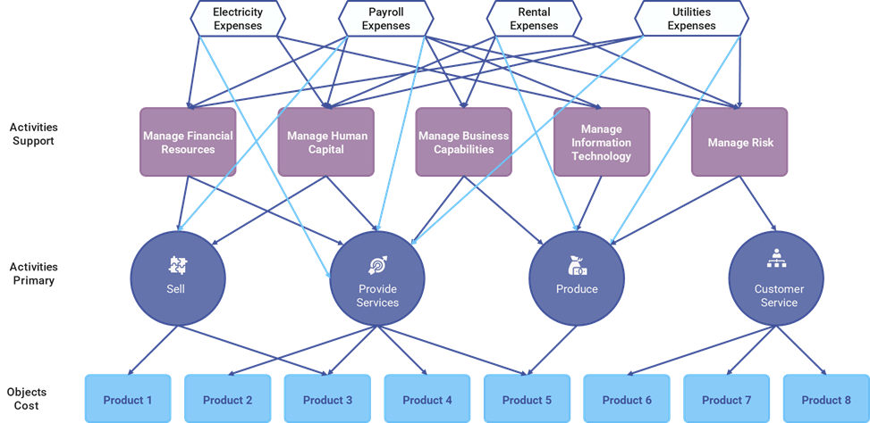 In the past, when models were made in a simple spreadsheet, the tendency was to use a very linear scheme of assignments. Typical ABC costing has three phases, each of which maps to the following: