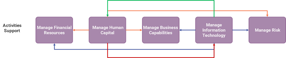 With this variant, we see that the activity of Managing Financial Resources in order to be executed must receive support from Human Capital Management and support from Information Technology.