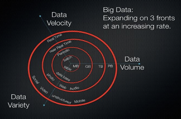 When we talk about big data, it is useful to turn to Gartner analyst Doug Laney, who, in a 2001 MetaGroup research post, "3D Data Management: Data Volume Control, variety and speed" introduced the concept of the 3Vs. 3Vs mean volume, variety, and velocity, the three big data properties. The volume refers to the amount of data, the variety refers to the number of data types and the speed refers to the speed of data processing. According to the 3V model, the challenges of big data management involve the expansion of the three properties, rather than just the volume.