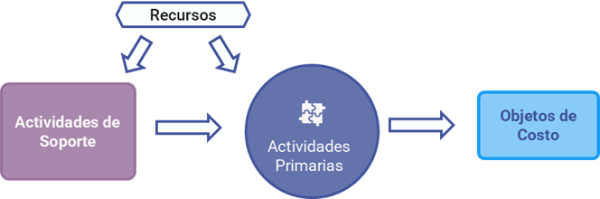 En este esquema en la parte de arriba tenemos los recursos, los cuales se asignan a las actividades primarias y de soporte. Luego las actividades de soporte se asignan a las actividades primarias y finalmente estas a los objetos de costo.