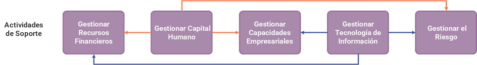 Con esta variante, vemos que la actividad de Gestionar Recursos Financieros para poderse ejecutar debe recibir un apoyo de Gestión de Capital Humano y un apoyo de Tecnología de Información.
