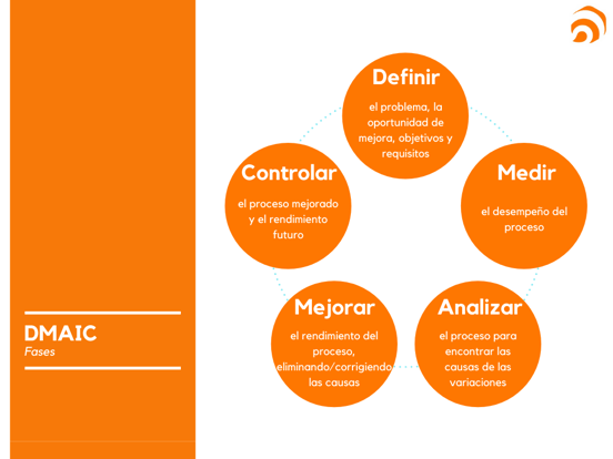 DMAIC es una herramienta utilizada en calidad para mejorar procesos. Las fases están representadas en el acrónimo, las cuales son: definir, medir, análisis, mejorar (improve) y controlar.