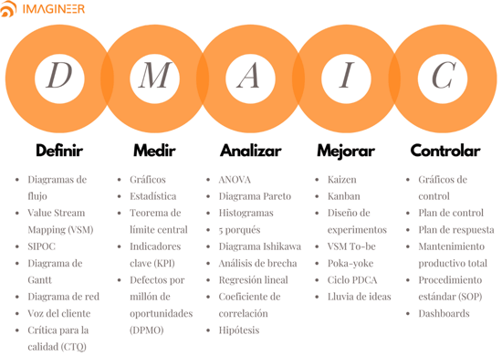 Dentro del marco de trabajo de esta filosofía existen diversas herramientas, pero en este blog te explicaré la metodología dmaic, que te dará la estructura con pasos a seguir para llevar a cabo esa mejora continua que buscas.