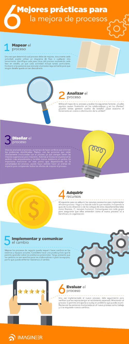 Estas 6 mejores prácticas son los pasos básicos para lograr mejorar los procesos, pero hay que comprender que estos no funcionan de forma aislada, es decir es importante integrar correctamente cada una de las mejores prácticas a tu negocio. Alineándolos con los objetivos que se tienen dentro de la corporación, intentando que los objetivos del negocio se adecuen a las diferentes necesidades que presente el proceso en cuanto la tecnología y el recurso humano que se necesite.